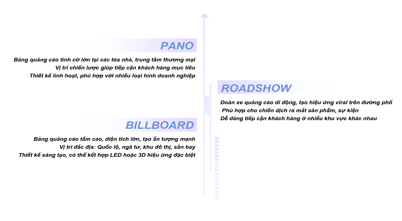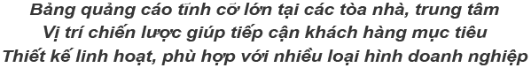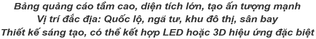 Chúng tôi cung cấp giải pháp QUẢNG CÁO NGOÀI TRỜI CHUYÊN NGHIỆP, GIÚP THƯƠNG HIỆU TIẾP CẬN KHÁCH HÀNG RỘNG RÃI VỚI HÌNH ẢNH ẤN TƯỢNG, THU HÚT VÀ TẠO DẤU ẤN MẠNH MẼ